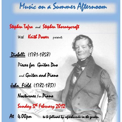 • We’re giving a concert of guitar and piano music, performed on period instruments, with our friend Keith Power. Music by Diabelli and Field. Feb 5th 2012, 4pm. There is no entry charge but seating is limited, RSVP details are on the poster.